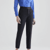 Flat front. Hint of stretch in the fabric. Straight leg silhouette. Satin waistband trim. Zip fly front with extended button closure. Front pockets. Satin side stripe.