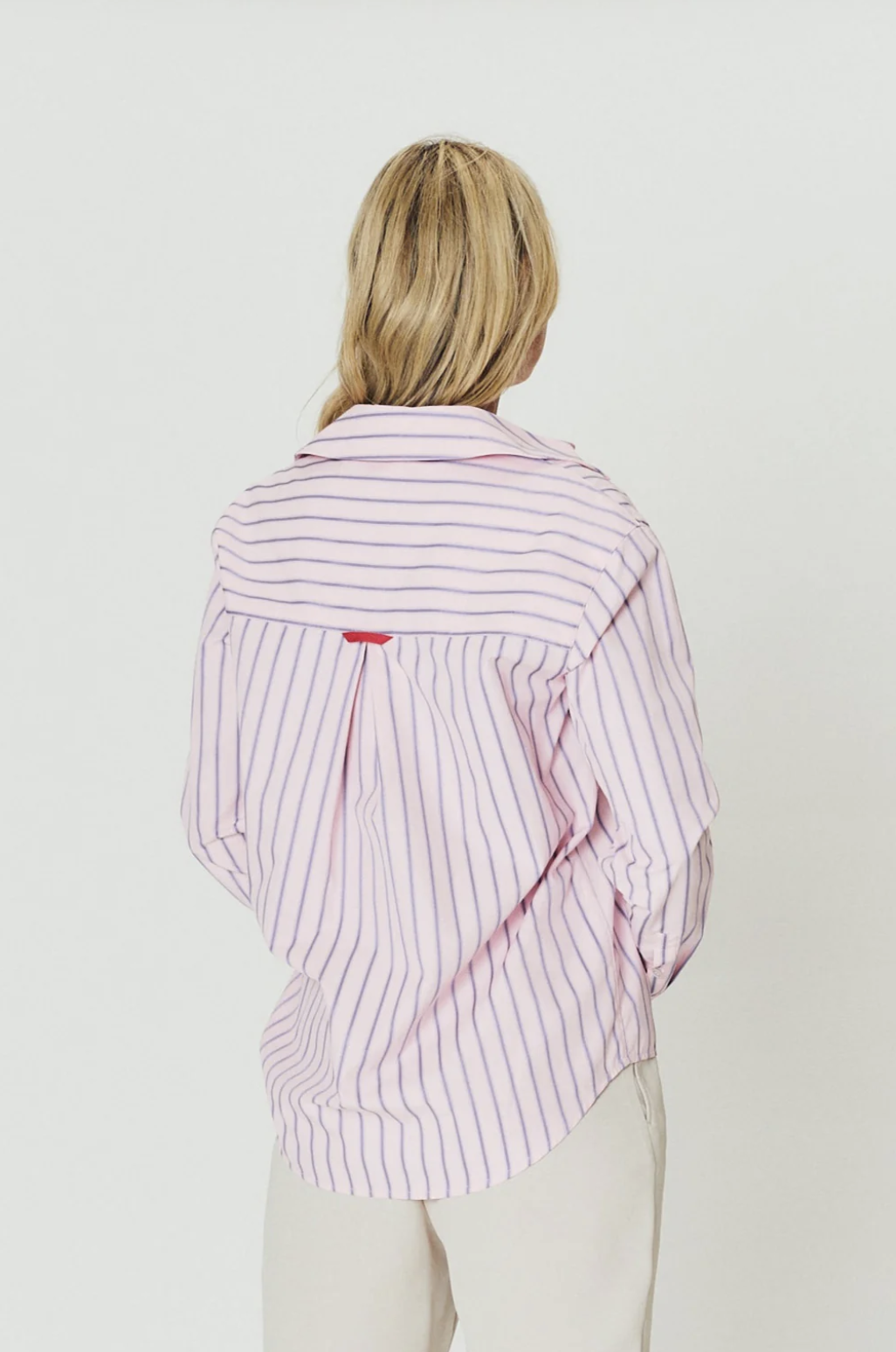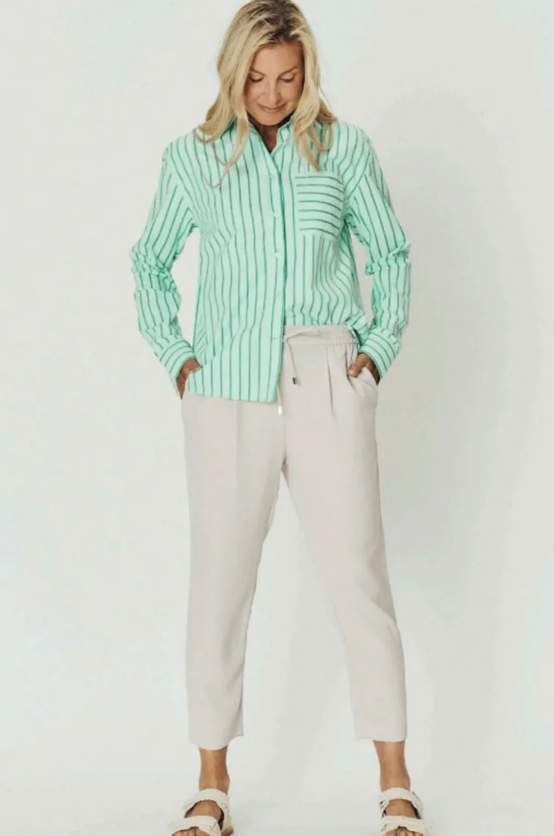 Made from a lightweight cotton-poly blend, it’s soft, breathable, and easy to wear all day. The candy-coloured stripe adds a fun, polished touch that works just as well for casual days as it does for dressier moments.