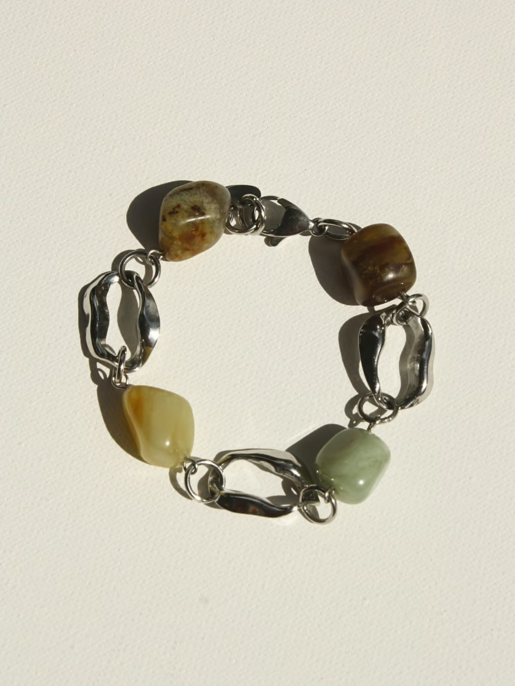 Made from 304 stainless steel fittings, this piece is non-tarnish and hypoallergenic, making it perfect for everyday wear. This statement design features twisted oval link charms and Natural Jade Xiuyan beads.