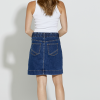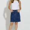 Simple, kneelength timeless slightly aline denim skirt. Featuring a flat front, elastic back and large patch pockets.
