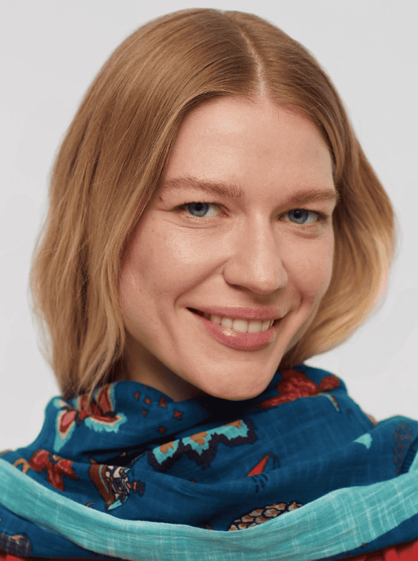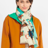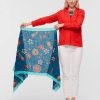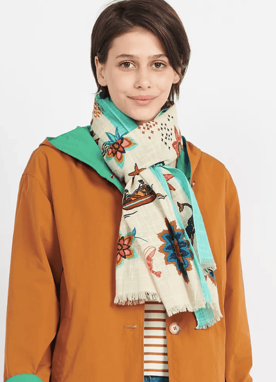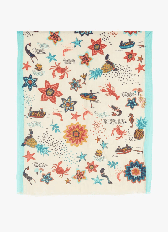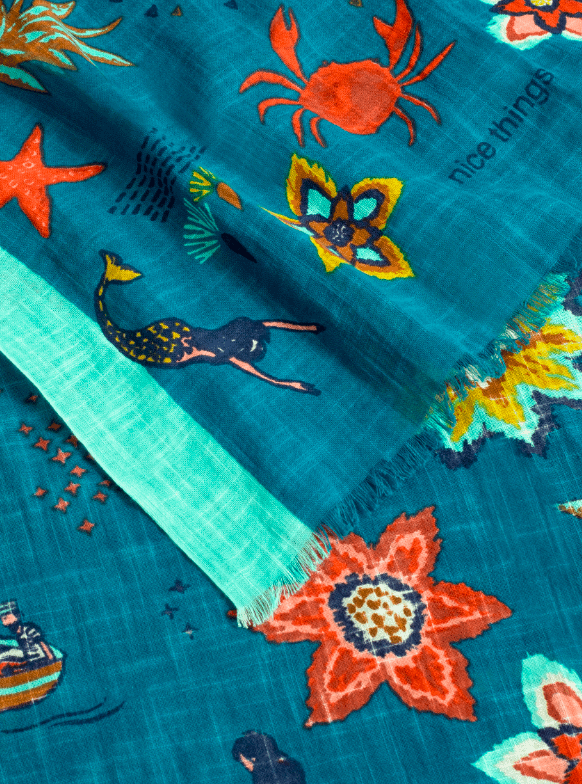Mermaid Affairs Shawl, with a varied and colorful print that includes flowers, mermaids, crabs and starfish. Made of 100% cotton, with two background colours, blue or beige, contrasting side stripes and frayed edges.