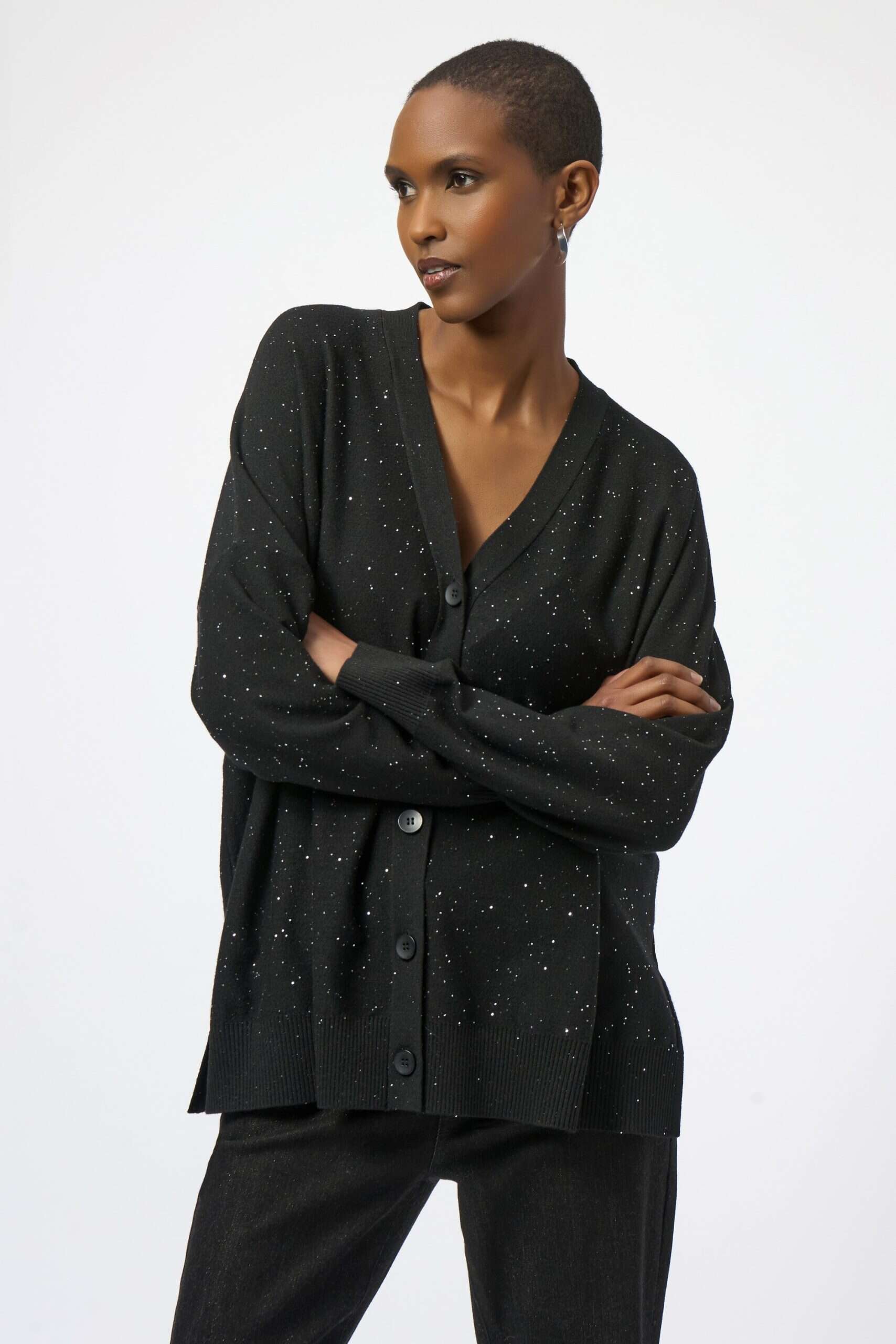 Crafted from sequined yarn, this shimmering sweater knit cardigan is designed to captivate. Featuring a flattering V-neckline, long dolman sleeves, and a sleek straight silhouette, this button-front piece adds a dazzling finishing touch to any outfit.