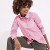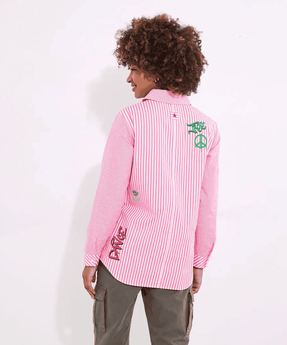 Meet the pink stripe shirt that’ll make a statement in any outfit. Balancing the unique graffiti prints with a button through design and tab to adjust the sleeves, you can easily wear it your way, stand out with heels and dressy trousers, or keep it casual with cargos and pumps.