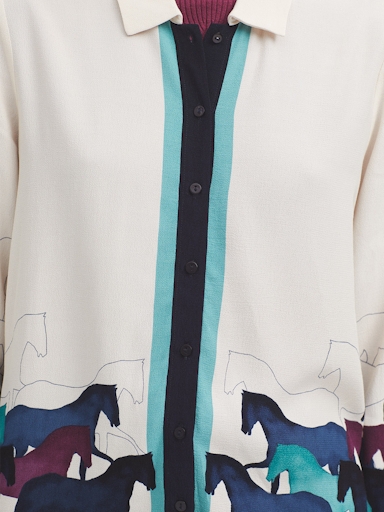 Bold “Wild Horses” print, creating a dynamic and adventurous look. The shirt has a classic collar and a button-front closure, adding a refined touch to the wild design. It also comes with long sleeves, offering versatility for different weather conditions. Perfect for those who want to merge a sense of untamed spirit with a sophisticated, structured look.