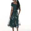 Off the shoulder neckline with empire waist and concealed back zipper in rich vibrant colour.