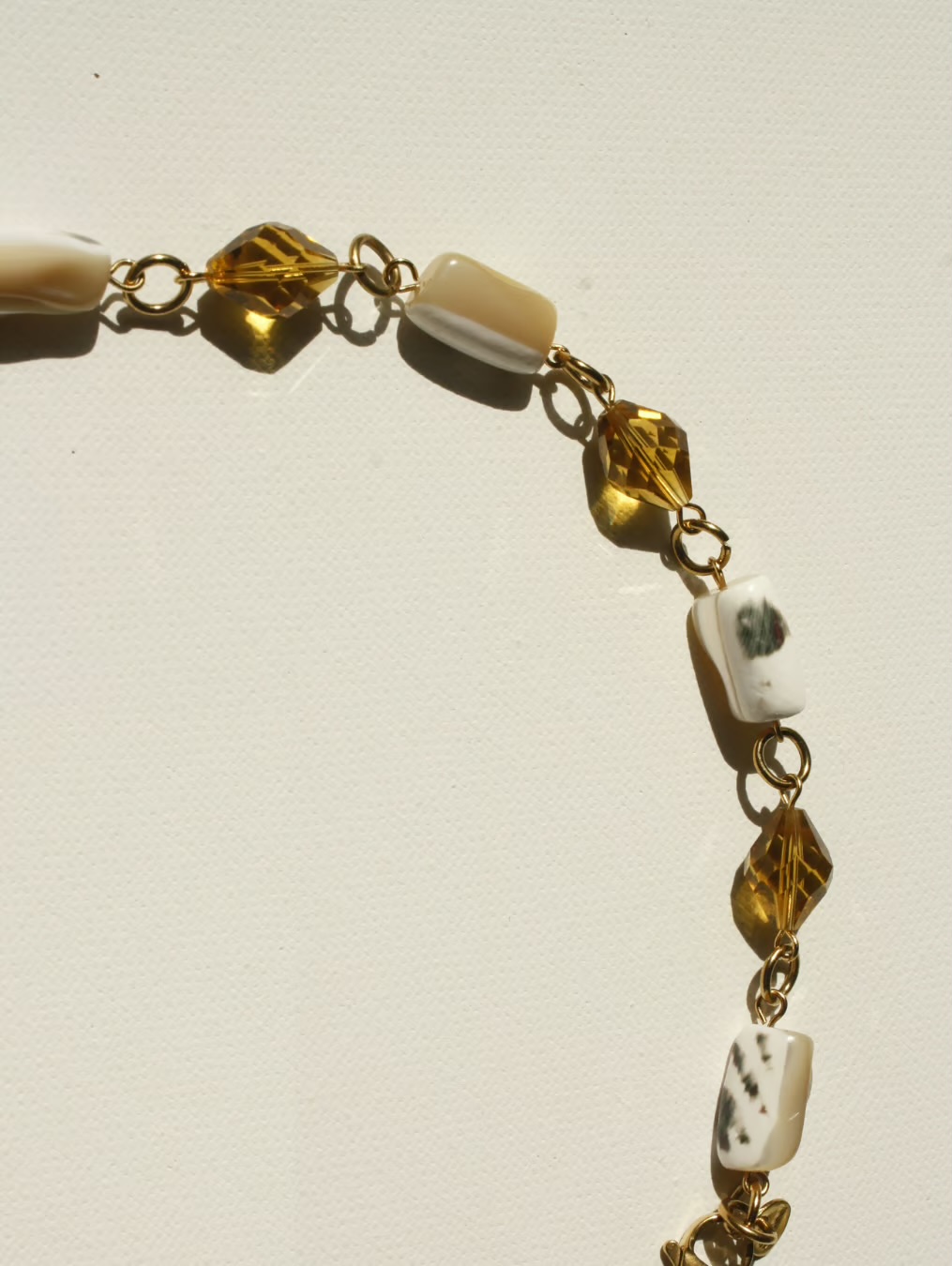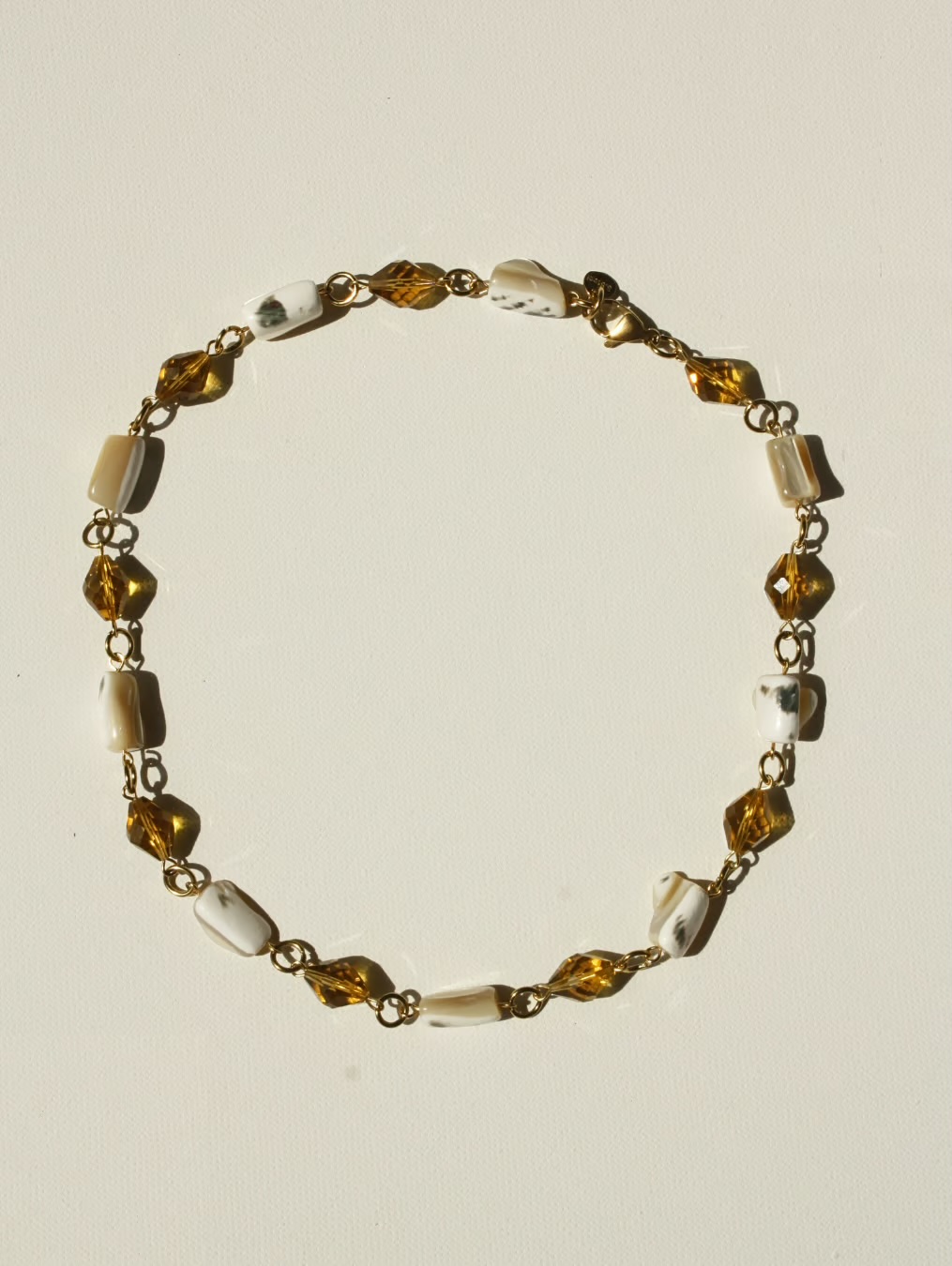 Crafted from Golden 304 stainless steel, this piece is hypoallergenic and non-tarnish, adorned with honey coloured glass beads and natural trochid shell beads.