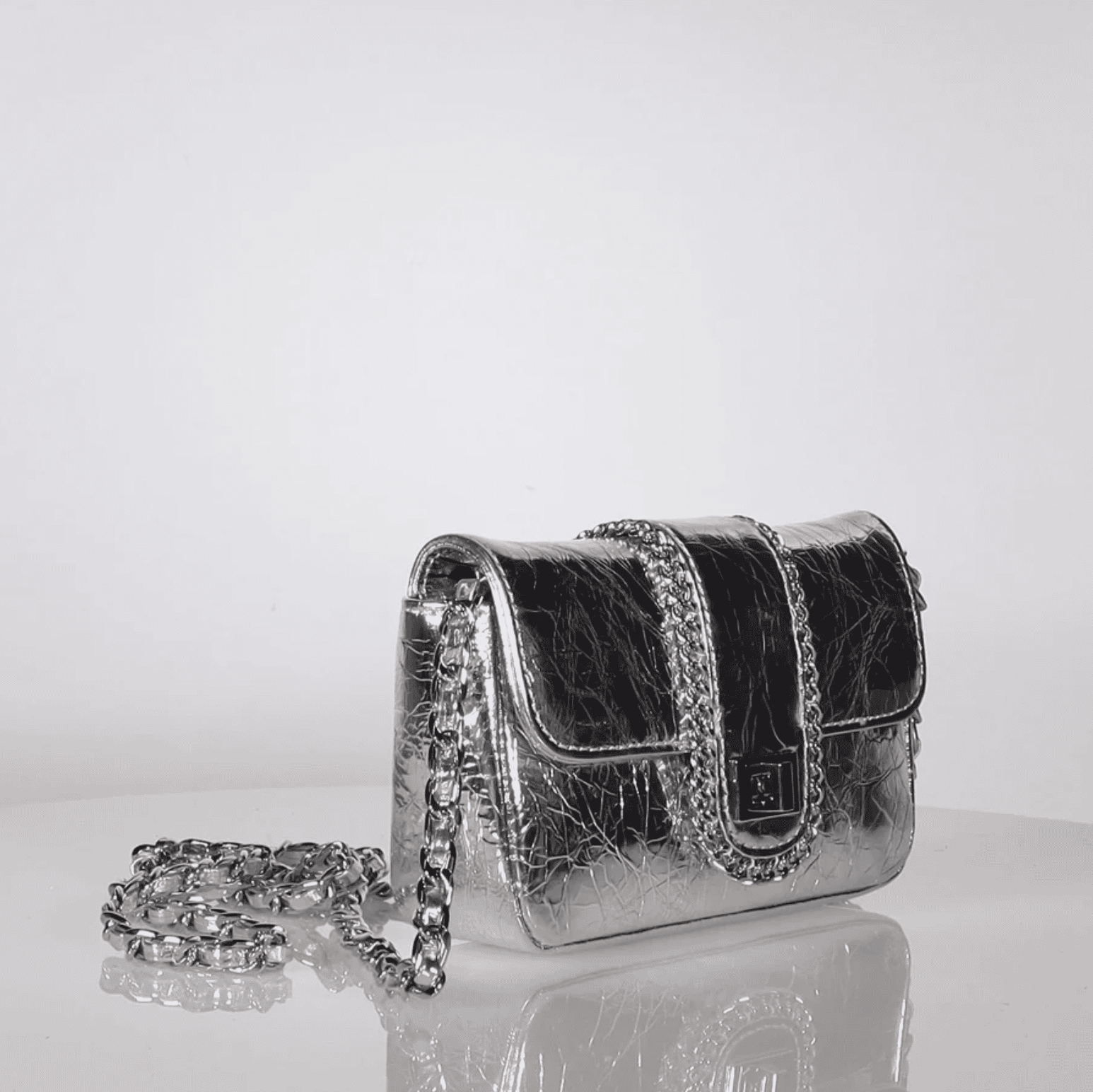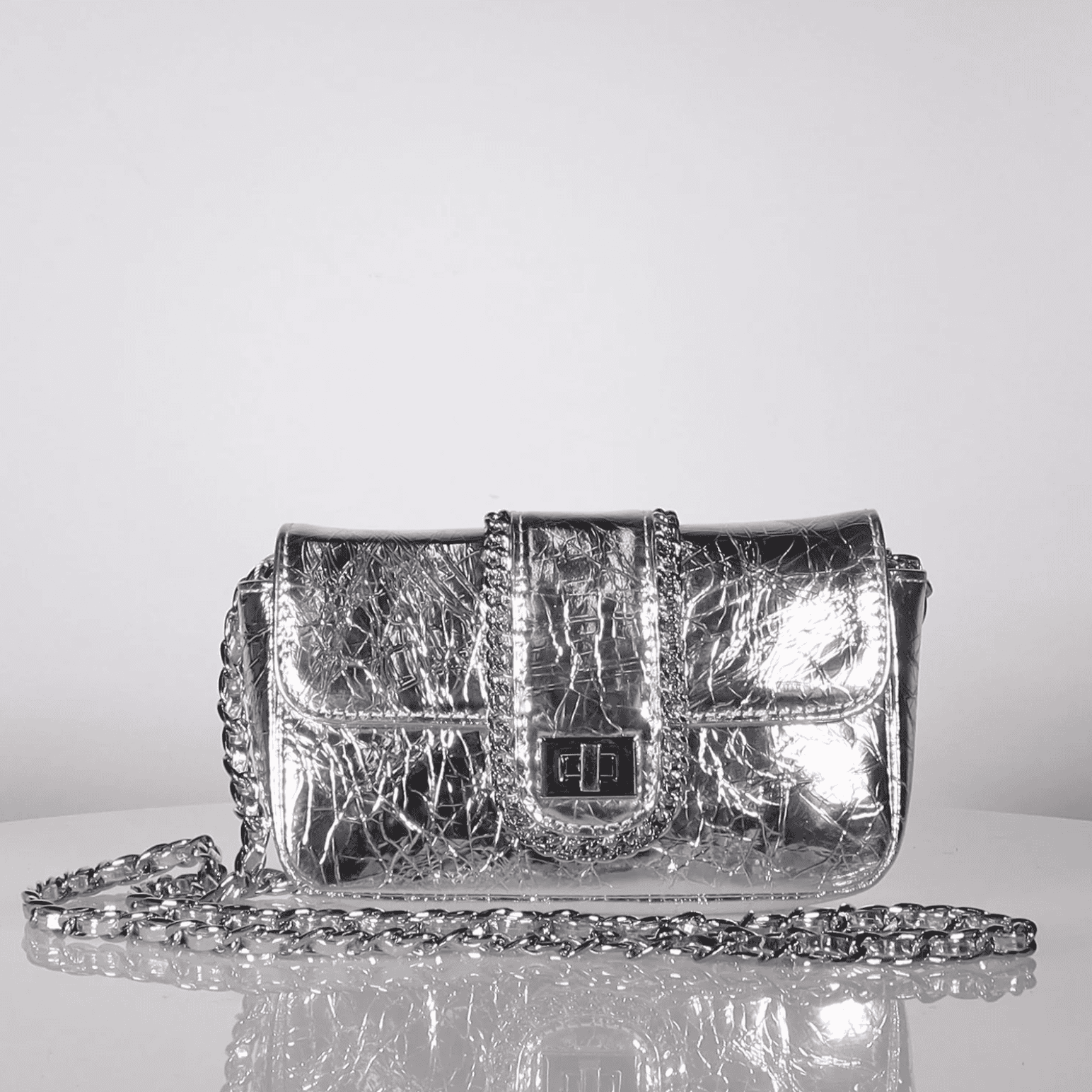This bag catches the light from every angle, making it the ultimate accessory for a night out. The chic chain and woven leather crossbody strap add a touch of edge while keeping your hands free for dancing or drinks. Compact yet spacious enough for all your essentials, the Cosmic Diva takes your evening look to the next level!