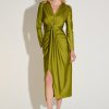 Make a striking impression with this dramatic sheath dress, designed to captivate. The draped V-neckline flows seamlessly into a cascading slit detail, exuding elegance with every step. Crafted from a refined knit fabric with a lustrous satin finish, this dress radiates sophistication. Long, straight sleeves offer graceful coverage, while the mid-calf length adds a hint of allure, making it perfect for unforgettable evenings. Part of the Signature Collection.