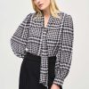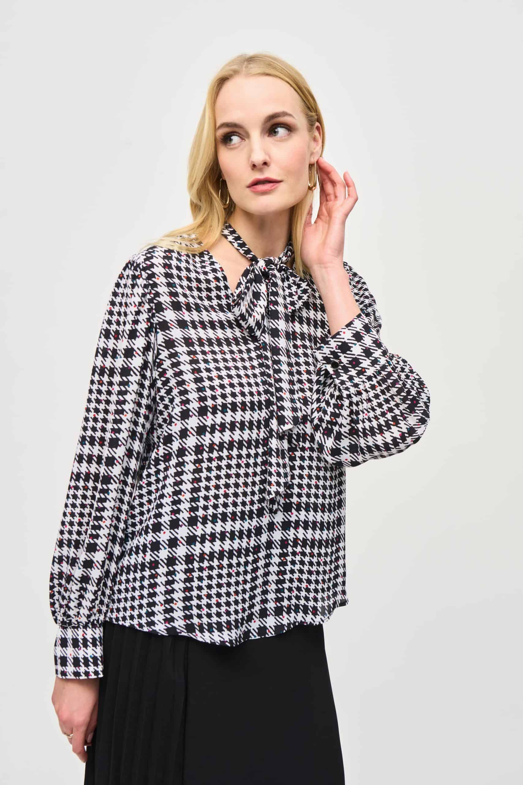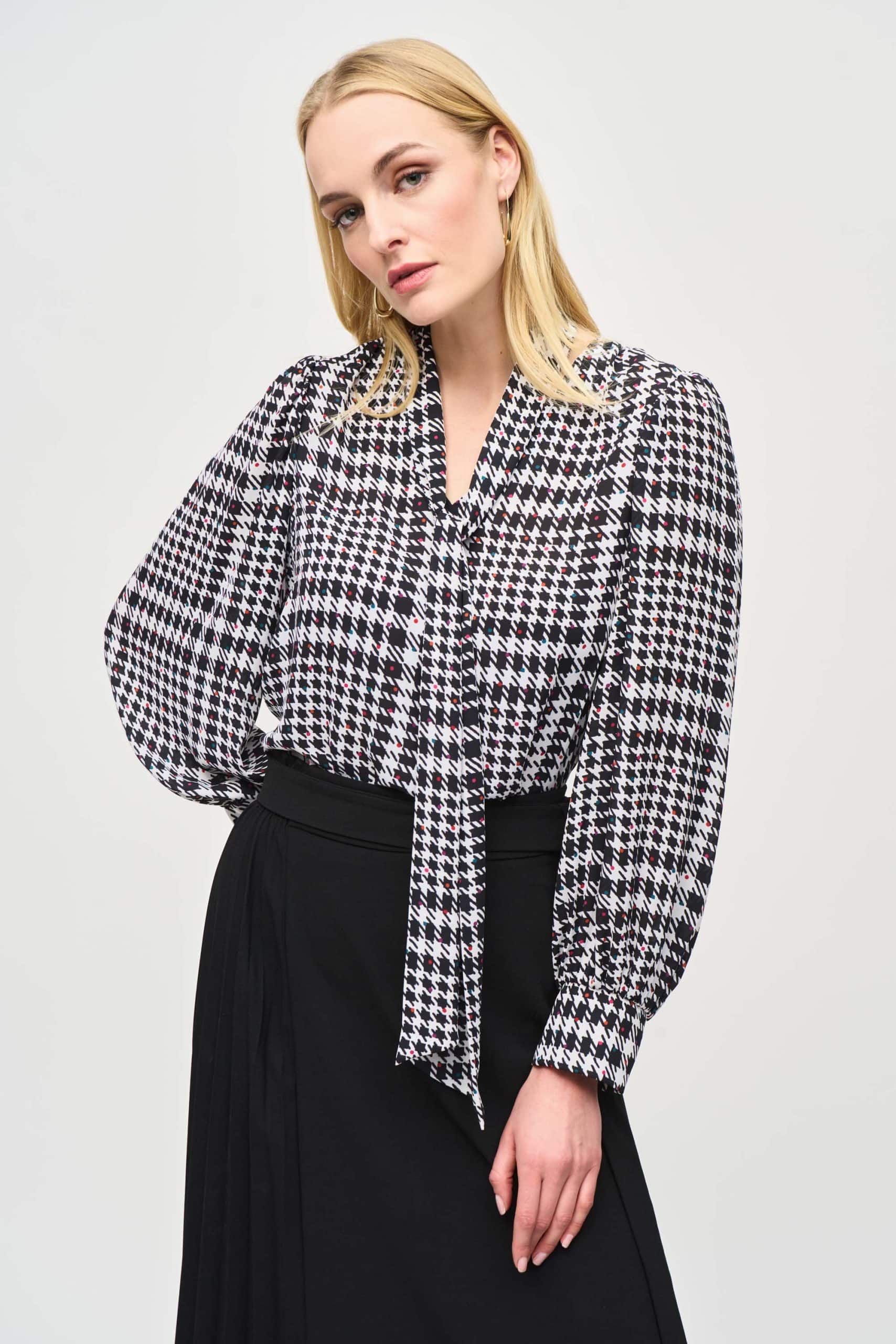 Tailored in a beautiful georgette fabric, this plaid top possesses the perfect air of elegance to elevate any attire. The V-neck design, accentuated by a charming scarf knotted at the center, adds refinement to this contemporary piece. Long puff sleeves with cuffs bring a playful yet confident feel to this charming top
