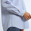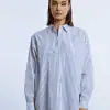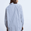A timeless classic with a twist. This oversized blue-and-white striped shirt shimmers subtly with iridescent threads woven through the fabric—catching the light in the most elegant way. Designed with a relaxed fit, crisp collar, and button-down front, it’s perfect for effortless styling—tucked into tailored trousers, layered over denim, or worn loose for a chic off-duty look.