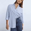 A timeless classic with a twist. This oversized blue-and-white striped shirt shimmers subtly with iridescent threads woven through the fabric—catching the light in the most elegant way. Designed with a relaxed fit, crisp collar, and button-down front, it’s perfect for effortless styling—tucked into tailored trousers, layered over denim, or worn loose for a chic off-duty look.