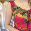 Gradient between Pink and Purple with White roses. Bottom is detailed with purple stitching. Ruched sleeve cuffs. Hand-screen-printed dress