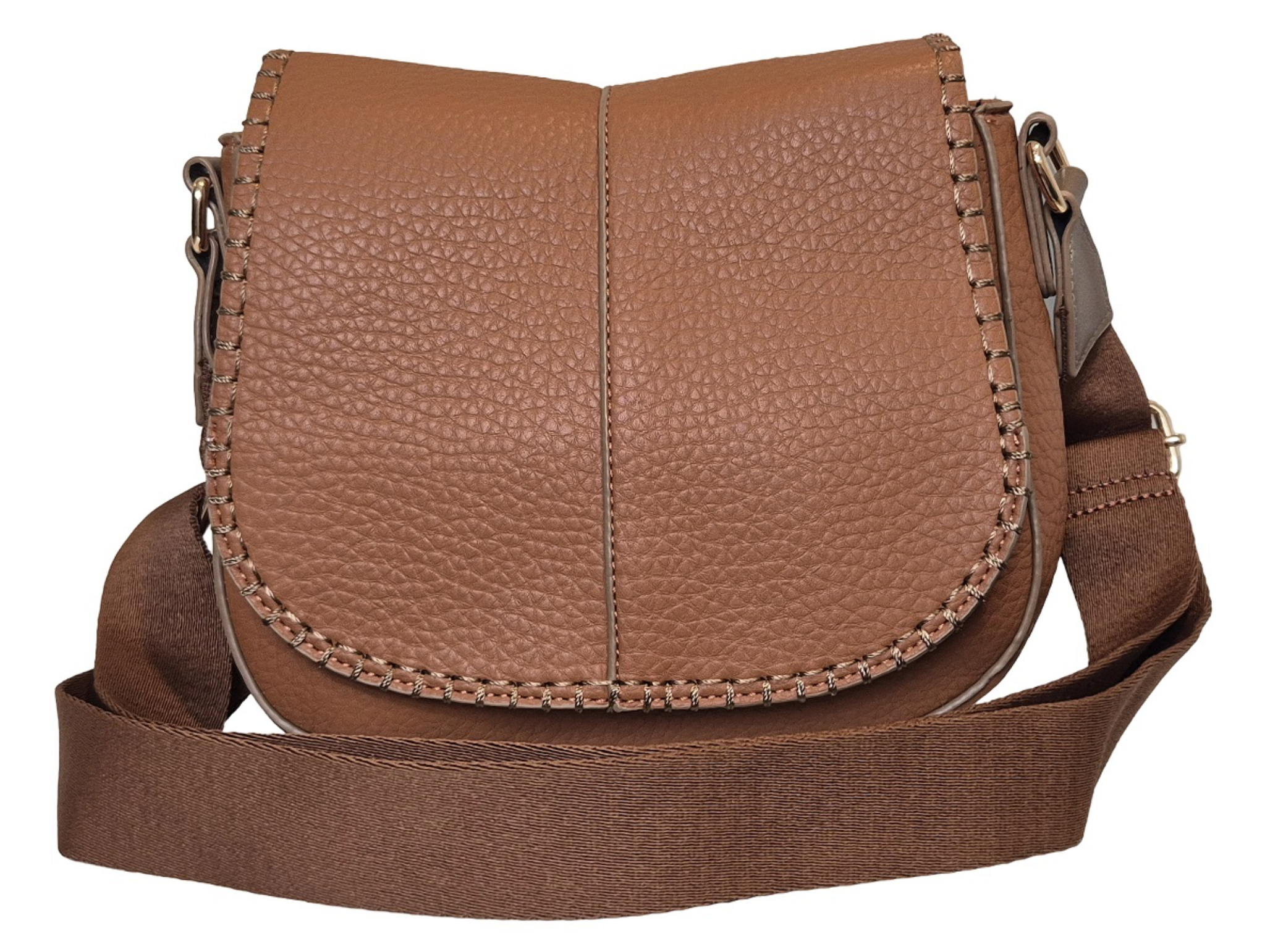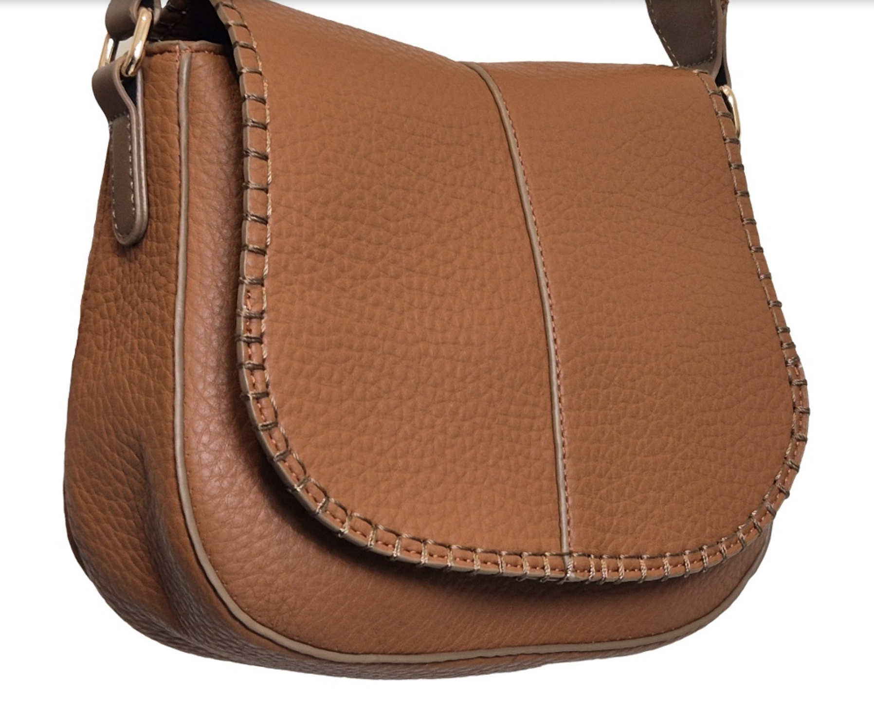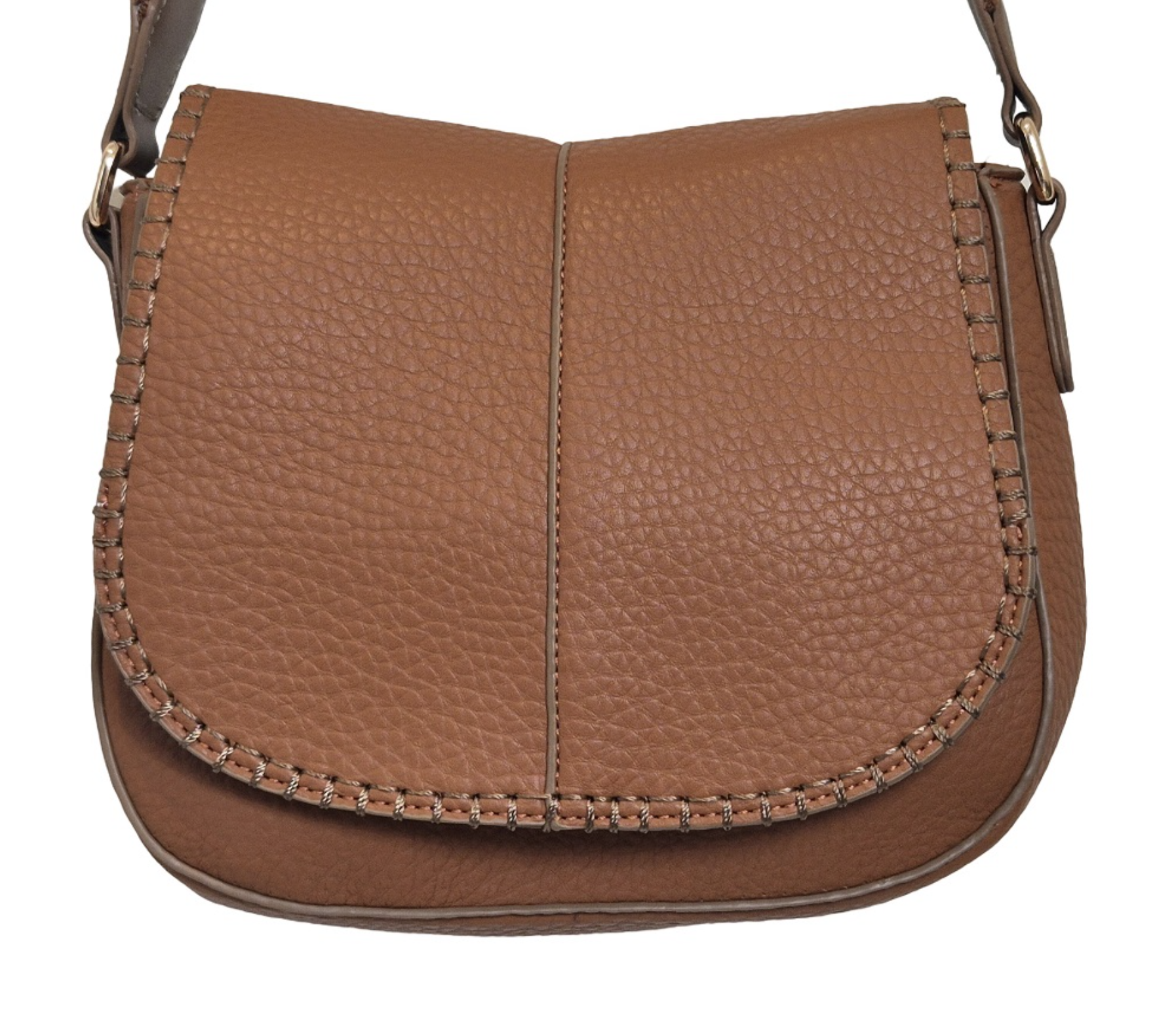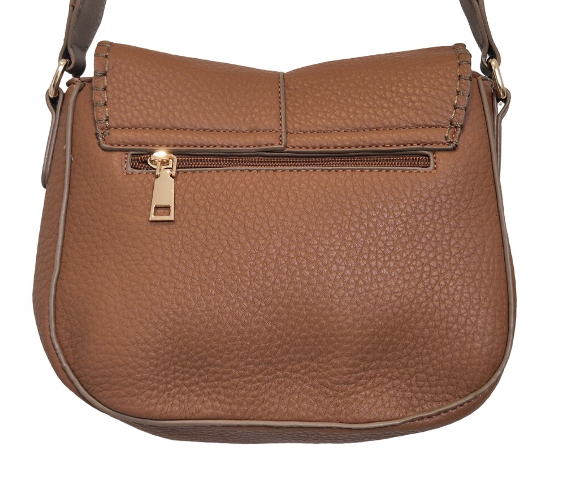 This stylish shoulder bag boasts a sleek vegan leather exterior with elegant stitching, a flap closure, and an adjustable strap adorned with gold-tone hardware. Its blend of functionality and fashion makes it a chic accessory for any occasion.