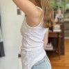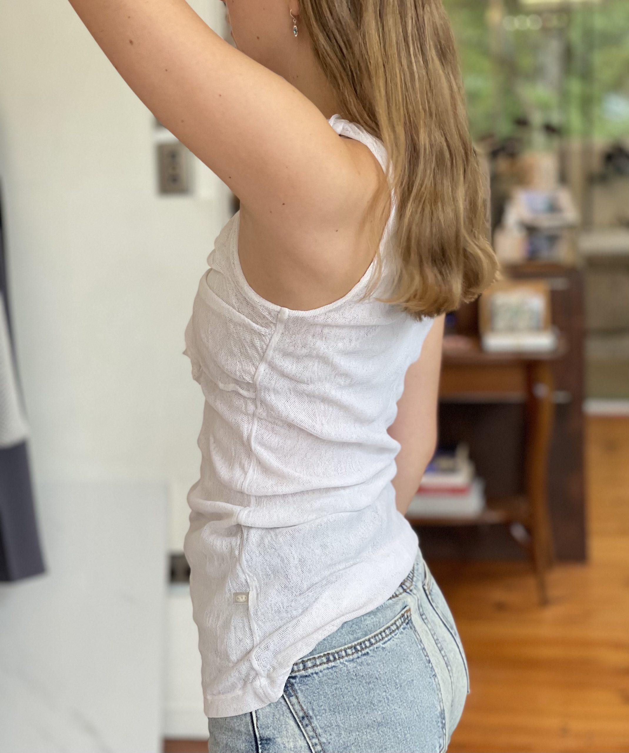 This is a white mesh top that gives stretch, has a tie detail and is a v-neck. Super cute for form weather and for dressing up or down.